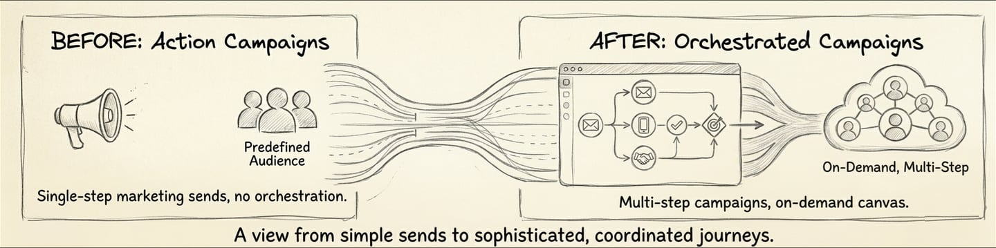 Prior to the introduction of Orchestrated Campaigns, AJO campaigns were limited, often described as marketing initiated, single step "blasts" sent to predefined audiences without an orchestration layer. AJO Orchestrated Campaigns fundamentally changes this landscape, bringing parity with AJO journeys by introducing multi step execution, on demand audience creation, and a crucial orchestration layer. Existing AJO campaigns remain available and are now referred to as Action Campaigns, while the new offering is known as AJO Orchestrated Campaigns. While Action Campaigns still rely on existing XDM schemas, Orchestrated Campaigns are built upon a new model based relational schema.