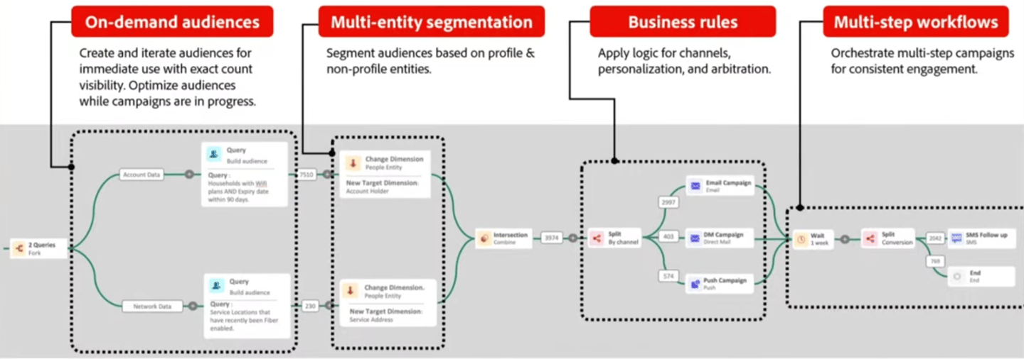 A key component is the new workflow canvas, which is highly synergistic with those found in traditional campaign management solutions like Adobe Campaign or Unica. This single canvas allows marketers to manage the entire process, from audience creation and business rule authoring to orchestrating multi step execution. Within the canvas, users have native activities for segmentation, including query, split, combine, deduplication, reconciliation, change dimension, forks, and joins. Crucially, the focus remains on delivering a message; non marketing activities like raw JavaScript loops or raw SQL code writing are not included in this canvas.