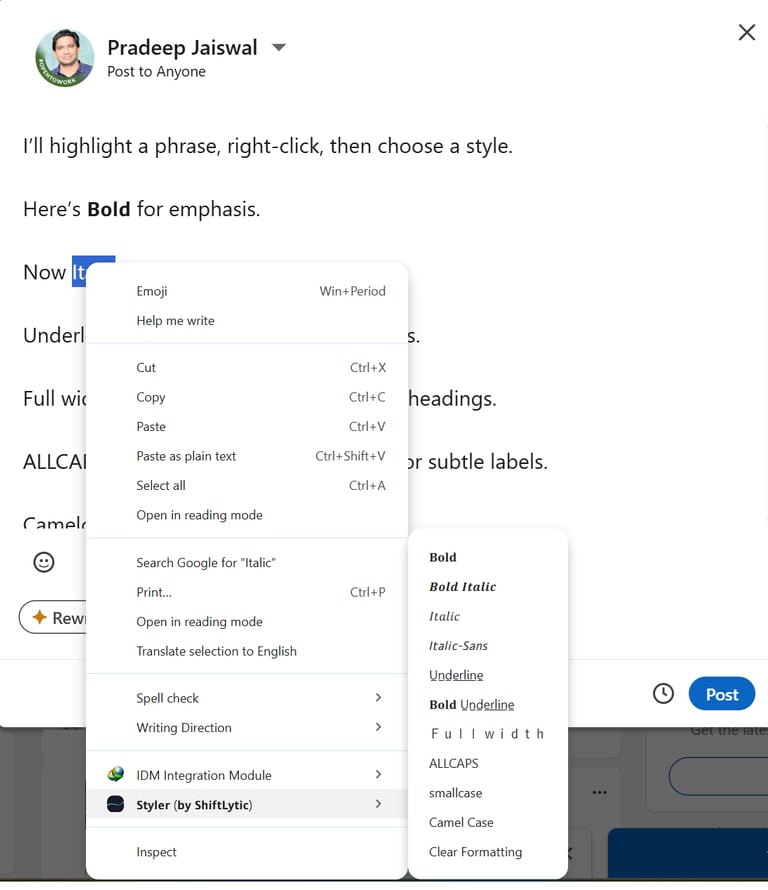 Don't let your insights get lost in a sea of plain text. Whether you're drafting a LinkedIn post, leaving a comment, or taking notes on a webpage, Styler gives you complete control over your text's appearance.